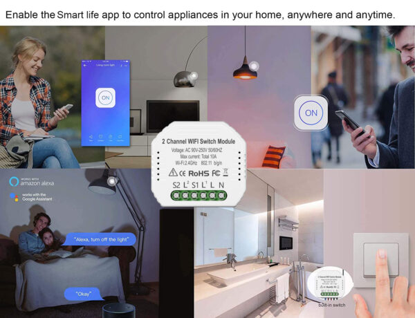 It’s a small 2 channel switch module which is installed into the switch box to make the traditional switch become smart, and can be controlled by mobile phone.